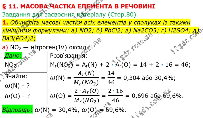 § 11. МАСОВА ЧАСТКА ЕЛЕМЕНТА В РЕЧОВИНІ Завдання для засвоєння матеріалу (Стор.80) 1. Обчисліть масові частки всіх елементів у сполуках із такими хімічними формулами: а) NO2; б) PbCl2; в) Na2CO3; г) H2SO4; д) Ba3(PO4)2; а) NO2 — нітроген(IV) оксид Дано: NO2 Розв‘язання: Mr(NO2) = Ar(N) + 2 ∙ Ar(O) = 14 + 2 ∙ 16 = 46; 𝜔(N) = (A_r (N))/(M_r (〖NO〗_2)) = 14/46 = 0,304 або 30,4%; ω(O) = (2 ∙ A_r (O))/(M_r (NO_2)) = (2 ∙ 16)/46 = 0,696 або 69,6%. Знайти: ω(N) - ? ω(O) - ? Відповідь: ω(N) = 30,4%, ω(O) = 69,6%.