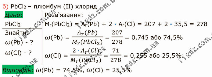 Розв‘язання: Mr(PbCl2) = Ar(Pb) + 2 ∙ Ar(Cl) = 207 + 2 ∙ 35,5 = 278 ω(Pb) = (A_r (Pb))/(M_r (〖PbCl〗_2)) = 207/278 = 0,745 або 74,5% ω(Cl) = (2 ∙ A_r (Cl))/(M_r (Pb〖Cl〗_2)) = 71/278 = 0,255 або 25,5%.