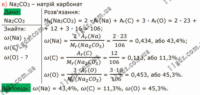 Розв‘язання: Mr(Na2CO3) = 2 ∙ Ar(Na) + Ar(C) + 3 ∙ Ar(O) = 2 ∙ 23 + + 12 + 3 ∙ 16 = 106; 𝜔(Na) = (2 ∙ A_r (Na))/(M_r (〖〖Na〗_2 CO〗_3)) = (2 ∙ 23)/106 = 0,434, або 43,4%; 𝜔(C) = ( A_r (C))/(M_r (〖Na〗_2 〖CO〗_3)) = 12/106 = 0,113, або 11,3%. ω(O) = ( 〖3 ∙ A〗_r (O))/(M_r (〖Na〗_2 〖CO〗_3)) = (3 ∙16)/106 = 0,453, або 45,3%.