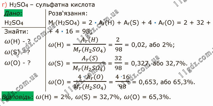 Розв‘язання: Mr(H2SO4) = 2 ∙ Ar(H) + Ar(S) + 4 ∙ Ar(O) = 2 + 32 + + 4 ∙ 16 = 98; 𝜔(H) = (A_r (H))/(M_r (〖H_2 SO〗_4)) = (2 )/98 = 0,02, або 2%; 𝜔(S) = ( A_r (S))/(M_r (H_2 〖SO〗_4)) = 32/98 = 0,327, або 32,7%. ω(O) = ( 〖4 ∙ A〗_r (O))/(M_r (H_2 〖SO〗_4)) = (4 ∙16)/98 = 0,653, або 65,3%.
