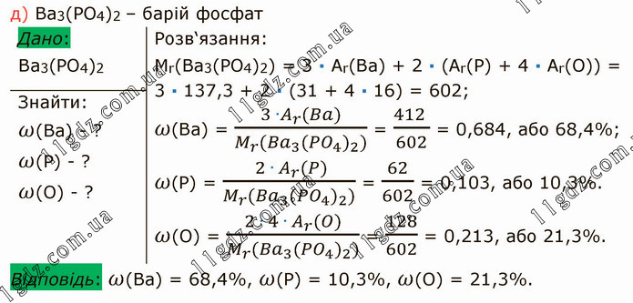 Розв‘язання: Mr(Ba3(PO4)2) = 3 ∙ Ar(Ba) + 2 ∙ (Ar(P) + 4 ∙ Ar(O)) = 3 ∙ 137,3 + 2 ∙ (31 + 4 ∙ 16) = 602; 𝜔(Ba) = (3 ∙A_r (Ba))/(M_r (〖〖Ba〗_3 (PO〗_4 )_2)) = (412 )/602 = 0,684, або 68,4%; 𝜔(P) = ( 〖2 ∙ A〗_r (P))/(M_r (〖〖Ba〗_3 (PO〗_4 )_2)) = 62/602 = 0,103, або 10,3%. ω(O) = (2 ∙ 〖4 ∙ A〗_r (O))/(M_r (〖〖Ba〗_3 (PO〗_4 )_2)) = 128/602 = 0,213, або 21,3%.