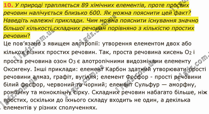 У природі трапляється 89 хімічних елементів, проте простих речовин налічується близько 600. Як можна пояснити цей факт? Наведіть належні приклади. Чим можна пояснити існування значно більшої кількості складних речовин порівняно з кількістю простих речовин? Це пов’язано з явищем алотропії: утворення елементом двох або кількох різних простих речовин. Так, проста речовина кисень О2 і проста речовина озон О3 є алотропічними видозмінами елементу Оксигену. Інші приклади: елемент Карбон здатний утворювати прості речовини алмаз, графіт, вугілля; елемент Фосфор - прості речовини білий фосфор, червоний та чорний; елемент Сульфур — аморфну, ромбічну та моноклінну сірку. Складних речовин набагато більше, ніж простих, оскільки до їхнього складу входить не один, а декілька елементів у різних сполученнях.
