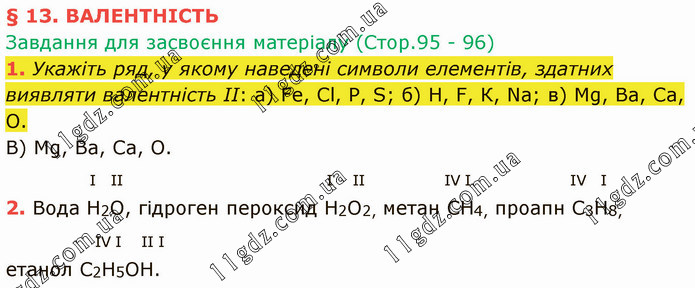 13. ВАЛЕНТНІСТЬ Завдання для засвоєння матеріалу (Стор.95 - 96) 1. Укажіть ряд, у якому наведені символи елементів, здатних виявляти валентність II: а) Fe, Cl, Р, S; б) Н, F, К, Na; в) Мg, Ва, Са, О.