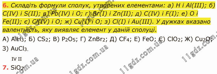 Складіть формули сполук, утворених елементами: а) Н і Аl(ІІІ); б) С(ІV) і S(ІІ); в) Рb(ІV) і О; г) Вг(І) і Zn(ІІ); д) С(IV) і F(І); е) О і Fе(ІІ); є) Сl(ІV) і О; ж) Сu(І) і О; з) Сl(І) і Аu(ІІІ). У дужках вказано валентність, яку виявляє елемент у даній сполуці. А) AlH3; Б) CS2; B) P2O5; Г) ZnBr2; Д) CF4; Е) FeO; Є) ClO2; Ж) Cu2O; З) AuCl3.