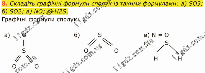 Складіть графічні формули сполук із такими формулами: а) SO3; б) SO2; в) NO; г) Н2S. Графічні формули сполук:
