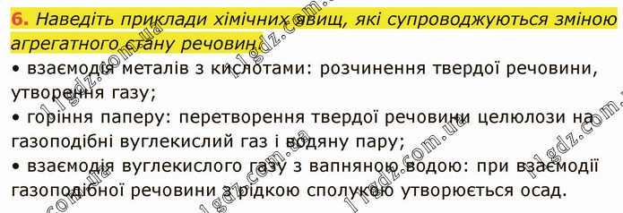 Наведіть приклади хімічних явищ, які супроводжуються зміною агрегатного стану речовин. • взаємодія металів з кислотами: розчинення твердої речовини, утворення газу; • горіння паперу: перетворення твердої речовини целюлози на газоподібні вуглекислий газ і водяну пару; • взаємодія вуглекислого газу з вапняною водою: при взаємодії газоподібної речовини з рідкою сполукою утворюється осад.