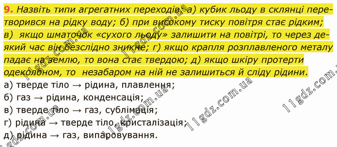 Назвіть типи агрегатних переходів: а) кубик льоду в склянці пере-творився на рідку воду; б) при високому тиску повітря стає рідким; в) якщо шматочок «сухого льоду» залишити на повітрі, то через де-який час він безслідно зникне; г) якщо крапля розплавленого металу падає на землю, то вона стає твердою; д) якщо шкіру протерти одеколоном, то незабаром на ній не залишиться й сліду рідини. а) тверде тіло → рідина, плавлення; б) газ → рідина, конденсація; в) тверде тіло → газ, сублімація; г) рідина → тверде тіло, кристалізація; д) рідина → газ, випаровування.