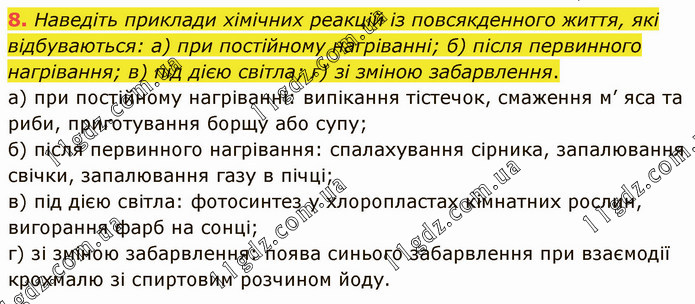 Наведіть приклади хімічних реакцій із повсякденного життя, які відбуваються: а) при постійному нагріванні; б) після первинного нагрівання; в) під дією світла; г) зі зміною забарвлення. а) при постійному нагріванні: випікання тістечок, смаження м’ яса та риби, приготування борщу або супу; б) після первинного нагрівання: спалахування сірника, запалювання свічки, запалювання газу в пічці; в) під дією світла: фотосинтез у хлоропластах кімнатних рослин, вигорання фарб на сонці; г) зі зміною забарвлення: поява синього забарвлення при взаємодії крохмалю зі спиртовим розчином йоду.