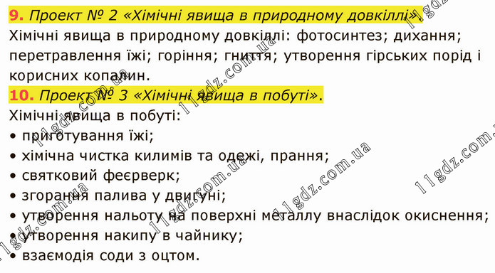 Проект № 2 «Хімічні явища в природному довкіллі». Хімічні явища в природному довкіллі: фотосинтез; дихання; перетравлення їжі; горіння; гниття; утворення гірських порід і корисних копалин. 10. Проект № 3 «Хімічні явища в побуті». Хімічні явища в побуті: • приготування їжі; • хімічна чистка килимів та одежі, прання; • святковий феєрверк; • згорання палива у двигуні; • утворення нальоту на поверхні металу внаслідок окиснення; • утворення накипу в чайнику; • взаємодія соди з оцтом.