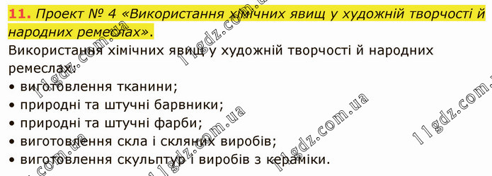 Проект № 4 «Використання хімічних явищ у художній творчості й народних ремеслах». Використання хімічних явищ у художній творчості й народних ремеслах: • виготовлення тканини; • природні та штучні барвники; • природні та штучні фарби; • виготовлення скла і скляних виробів; • виготовлення скульптур і виробів з кераміки.