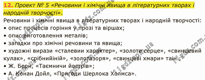 Проект № 5 «Речовини і хімічні явища в літературних творах і народній творчості». Речовини і хімічні явища в літературних творах і народній творчості: • опис процесів горіння у прозі та віршах; • опис виготовлення металів; • загадки про хімічні речовини та явища; • художні вирази «сталевии характер», «золоте серце», «свинцевий кулак», «срібнийіній», «золотазоря», «свинцеві хмари» таін.; • Ж. Берн, «Таємничи йострів»; • А. Конан Дойл, «Пригоди Шерлока Холмса».