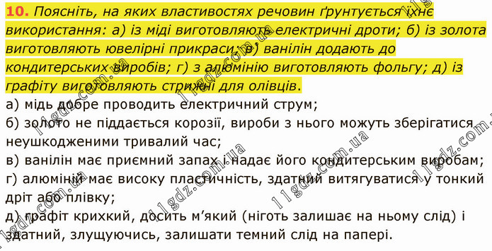Поясніть, на яких властивостях речовин ґрунтується їхнє використання: а) із міді виготовляють електричні дроти; б) із золота виготовляють ювелірні прикраси; в) ванілін додають до кондитерських виробів; г) з алюмінію виготовляють фольгу; д) із графіту виготовляють стрижні для олівців. а) мідь добре проводить електричний струм; б) золото не піддається корозії, вироби з нього можуть зберігатися неушкодженими тривалий час; в) ванілін має приємний запах і надає його кондитерським виробам; г) алюміній має високу пластичність, здатний витягуватися у тонкий дріт або плівку; д) графіт крихкий, досить м’який (ніготь залишає на ньому слід) і здатний, злущуючись, залишати темний слід на папері.