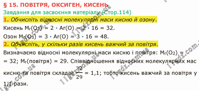 § 15. ПОВІТРЯ, ОКСИГЕН, КИСЕНЬ Завдання для засвоєння матеріалу (Стор.114) 1. Обчисліть відносні молекулярні маси кисню й озону. Кисень Мr(O2) = 2 ∙ Аr(O) = 2 ∙ 16 = 32. Озон Мr(O3) = 3 ∙ Аr(O) = 3 ∙ 16 = 48. 2. Обчисліть, у скільки разів кисень важчий за повітря. Визначаємо відносні молекулярні маси кисню і повітря: Мr(O2) = = 32; Мr(повітря) = 29. Співвідношення відносних молекулярних мас кисню та повітря складає 32/29 = 1,1; тобто кисень важчий за повітря у 1,1 рази.