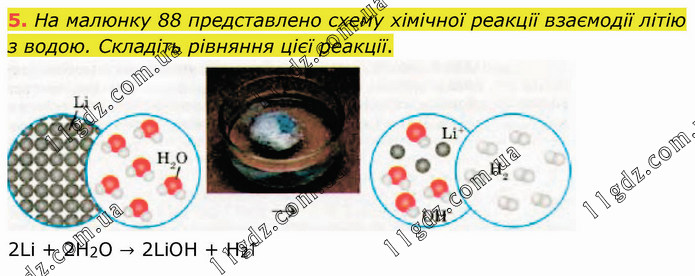На малюнку 88 представлено схему хімічної реакції взаємодії літію з водою. Складіть рівняння цієї реакції. 2Li + 2H2O → 2LiOH + H2↑