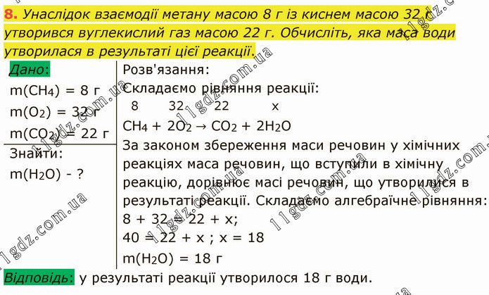 Унаслідок взаємодії метану масою 8 г із киснем масою 32 г утворився вуглекислий газ масою 22Розв'язання: Складаємо рівняння реакції: 8 32 22 х СН4 + 2О2 → СО2 + 2Н2О За законом збереження маси речовин у хімічних реакціях маса речовин, що вступили в хімічну реакцію, дорівнює масі речовин, що утворилися в результаті реакції. Складаємо алгебраїчне рівняння: 8 + 32 = 22 + х; 40 = 22 + х ; х = 18 m(Н2O) = 18 г г. Обчисліть, яка маса води утворилася в результаті цієї реакції.