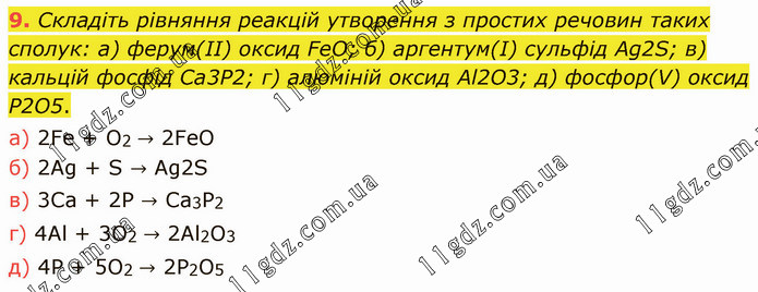 Складіть рівняння реакцій утворення з простих речовин таких сполук: а) ферум(ІІ) оксид FeО; б) аргентум(І) сульфід Аg2S; в) кальцій фосфід Са3Р2; г) алюміній оксид Аl2О3; д) фосфор(V) оксид Р2О5. а) 2Fe + O2 → 2FeO б) 2Ag + S → Ag2S в) 3Ca + 2P → Ca3P2 г) 4Al + 3O2 → 2Al2O3 д) 4P + 5O2 → 2P2O5