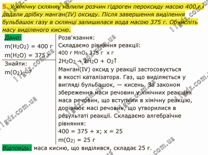 У хімічну склянку налили розчин гідроген пероксиду масою 400 г і додали дрібку манган(ІV) оксиду. Після завершення виділення бульбашок газу в склянці залишилася вода масою 375 г. Обчисліть масу виділеного кисню. Розв'язання: Складаємо рівняння реакції: 400 г MnO2 375 г х г 2Н2О2 → 2Н2О + О2↑ Манган(ІV) оксид у реакції застосовується в якості каталізатора. Газ, що виділяється у вигляді бульбашок, — кисень. За законом збереження маси речовин у хімічних реакціях маса речовин, що вступили в хімічну реакцію, дорівнює масі речовин, що утворилися в результаті реакції. Складаємо алгебраїчне рівняння: 400 = 375 + x; x = 25 m(O2) = 25 г