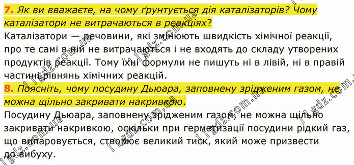 Як ви вважаєте, на чому ґрунтується дія каталізаторів? Чому каталізатори не витрачаються в реакціях? Каталізатори — речовини, які змінюють швидкість хімічної реакції, про те самі в ній не витрачаються і не входять до складу утворених продуктів реакції. Тому їхні формули не пишуть ні в лівій, ні в правій частині рівнянь хімічних реакцій. 8. Поясніть, чому посудину Дьюара, заповнену зрідженим газом, не можна щільно закривати накривкою. Посудину Дьюара, заповнену зрідженим газом, не можна щільно закривати накривкою, оскільки при герметизації посудини рідкий газ, що випаровується, створює великий тиск, який може призвести до вибуху.