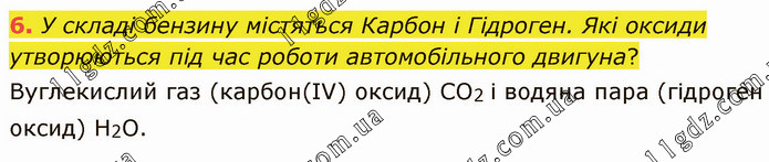 У складі бензину містяться Карбон і Гідроген. Які оксиди утворюються під час роботи автомобільного двигуна? Вуглекислий газ (карбон(ІV) оксид) СO2 і водяна пара (гідроген оксид) Н2O.
