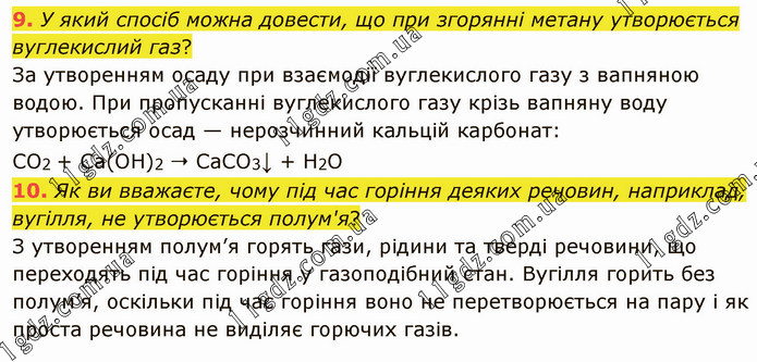 У який спосіб можна довести, що при згорянні метану утворюється вуглекислий газ? За утворенням осаду при взаємодії вуглекислого газу з вапняною водою. При пропусканні вуглекислого газу крізь вапняну воду утворюється осад — нерозчинний кальцій карбонат: СO2 + Са(ОН)2 ➝ СаСO3↓ + Н2O 10. Як ви вважаєте, чому під час горіння деяких речовин, наприклад, вугілля, не утворюється полум'я? З утворенням полум’я горять гази, рідини та тверді речовини, що переходять під час горіння у газоподібний стан. Вугілля горить без полум’я, оскільки під час горіння воно не перетворюється на пару і як проста речовина не виділяє горючих газів.