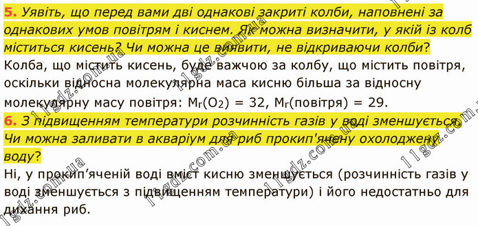 Уявіть, що перед вами дві однакові закриті колби, наповнені за однакових умов повітрям і киснем. Як можна визначити, у якій із колб міститься кисень? Чи можна це виявити, не відкриваючи колби? Колба, що містить кисень, буде важчою за колбу, що містить повітря, оскільки відносна молекулярна маса кисню більша за відносну молекулярну масу повітря: Мr(O2) = 32, Мr(повітря) = 29. 6. З підвищенням температури розчинність газів у воді зменшується. Чи можна заливати в акваріум для риб прокип'ячену охолоджену воду? Ні, у прокип’яченій воді вміст кисню зменшується (розчинність газів у воді зменшується з підвищенням температури) і його недостатньо для дихання риб.