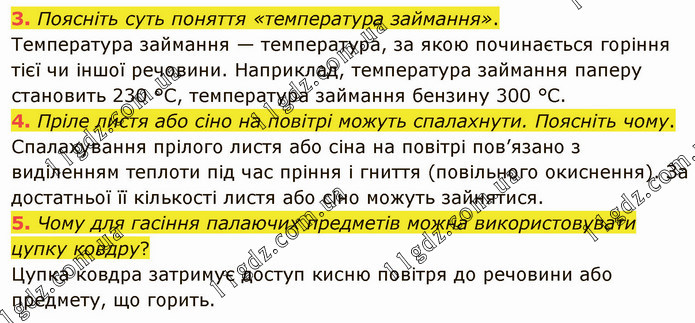 Поясніть суть поняття «температура займання». Температура займання — температура, за якою починається горіння тієї чи іншої речовини. Наприклад, температура займання паперу становить 230 °С, температура займання бензину 300 °С. 4. Пріле листя або сіно на повітрі можуть спалахнути. Поясніть чому. Спалахування прілого листя або сіна на повітрі пов’язано з виділенням теплоти під час пріння і гниття (повільного окиснення). За достатньої її кількості листя або сіно можуть зайнятися. 5. Чому для гасіння палаючих предметів можна використовувати цупку ковдру? Цупка ковдра затримує доступ кисню повітря до речовини або предмету, що горить.