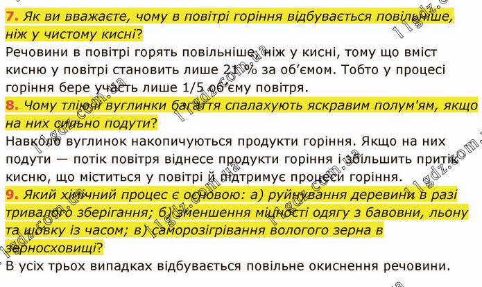 Як ви вважаєте, чому в повітрі горіння відбувається повільніше, ніж у чистому кисні? Речовини в повітрі горять повільніше, ніж у кисні, тому що вміст кисню у повітрі становить лише 21 % за об’ємом. Тобто у процесі горіння бере участь лише 1/5 об’єму повітря. 8. Чому тліючі вуглинки багаття спалахують яскравим полум'ям, якщо на них сильно подути? Навколо вуглинок накопичуються продукти горіння. Якщо на них подути — потік повітря віднесе продукти горіння і збільшить притік кисню, що міститься у повітрі й підтримує процеси горіння. 9. Який хімічний процес є основою: а) руйнування деревини в разі тривалого зберігання; б) зменшення міцності одягу з бавовни, льону та шовку із часом; в) саморозігрівання вологого зерна в зерносховищі? В усіх трьох випадках відбувається повільне окиснення речовини.