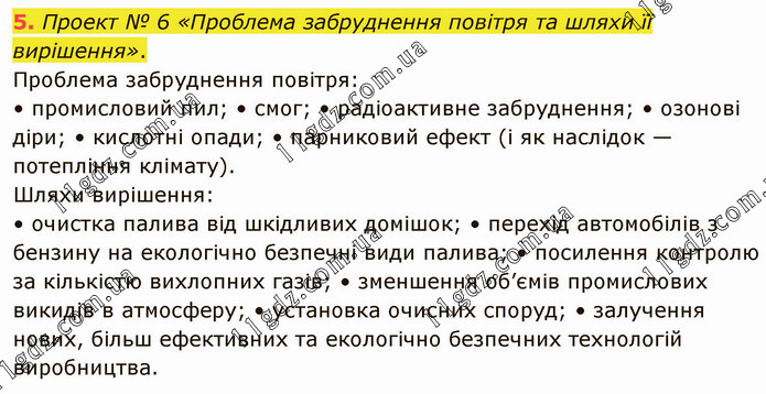 Проект № 6 «Проблема забруднення повітря та шляхи її вирішення». Проблема забруднення повітря: • промисловий пил; • смог; • радіоактивне забруднення; • озонові діри; • кислотні опади; • парниковий ефект (і як наслідок — потепління клімату). Шляхи вирішення: • очистка палива від шкідливих домішок; • перехід автомобілів з бензину на екологічно безпечні види палива; • посилення контролю за кількістю вихлопних газів; • зменшення об’ємів промислових викидів в атмосферу; • установка очисних споруд; • залучення нових, більш ефективних та екологічно безпечних технологій виробництва.