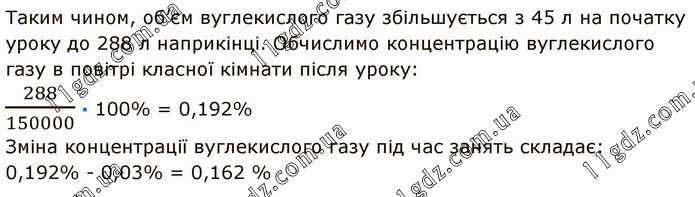 Таким чином, об’єм вуглекислого газу збільшується з 45 л на початку уроку до 288 л наприкінці. Обчислимо концентрацію вуглекислого газу в повітрі класної кімнати після уроку: 288/150000 ∙ 100% = 0,192% Зміна концентрації вуглекислого газу під час занять складає: 0,192% - 0,03% = 0,162 %