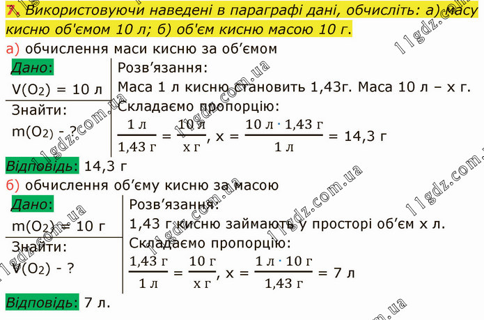 Використовуючи наведені в параграфі дані, обчисліть: а) масу кисню об'ємом 10 л; б) об'єм кисню масою 10 г. Розв’язання: Маса 1 л кисню становить 1,43г. Маса 10 л – х г. Складаємо пропорцію: (1 л)/(1,43 г) = (10 л)/(х г), х = (10 л ∙ 1,43 г)/(1 л) = 14,3 г б) Розв’язання: 1,43 г кисню займають у просторі об’єм х л. Складаємо пропорцію: (1,43 г)/(1 л) = (10 г)/(х г), х = (1 л ∙ 10 г)/(1,43 г) = 7 л