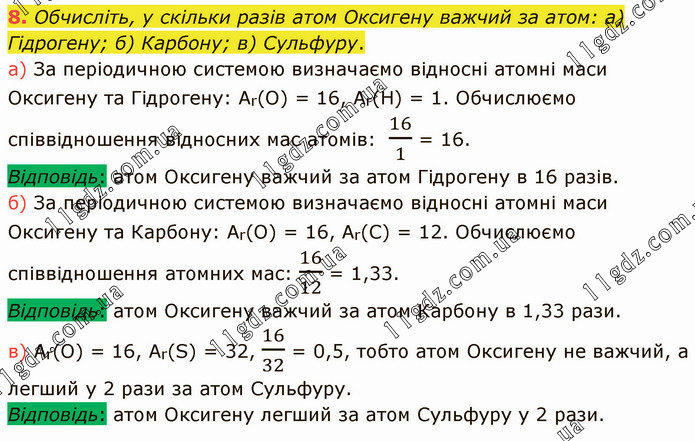 Обчисліть, у скільки разів атом Оксигену важчий за атом: а) Гідрогену; б) Карбону; в) Сульфуру. а) За періодичною системою визначаємо відносні атомні маси Оксигену та Гідрогену: Аr(O) = 16, Ar(Н) = 1. Обчислюємо співвідношення відносних мас атомів: 16/1 = 16. Відповідь: атом Оксигену важчий за атом Гідрогену в 16 разів. б) За періодичною системою визначаємо відносні атомні маси Оксигену та Карбону: Аr(O) = 16, Ar(С) = 12. Обчислюємо співвідношення атомних мас: 16/12 = 1,33. Відповідь: атом Оксигену важчий за атом Карбону в 1,33 рази. в) Аr(O) = 16, Ar(S) = 32, 16/32 = 0,5, тобто атом Оксигену не важчий, а легший у 2 рази за атом Сульфуру. Відповідь: атом Оксигену легший за атом Сульфуру у 2 рази.