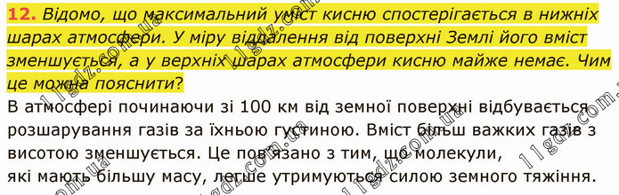 Відомо, що максимальний уміст кисню спостерігається в нижніх шарах атмосфери. У міру віддалення від поверхні Землі його вміст зменшується, а у верхніх шарах атмосфери кисню майже немає. Чим це можна пояснити? В атмосфері починаючи зі 100 км від земної поверхні відбувається розшарування газів за їхньою густиною. Вміст більш важких газів з висотою зменшується. Це пов’язано з тим, що молекули, які мають більшу масу, легше утримуються силою земного тяжіння.
