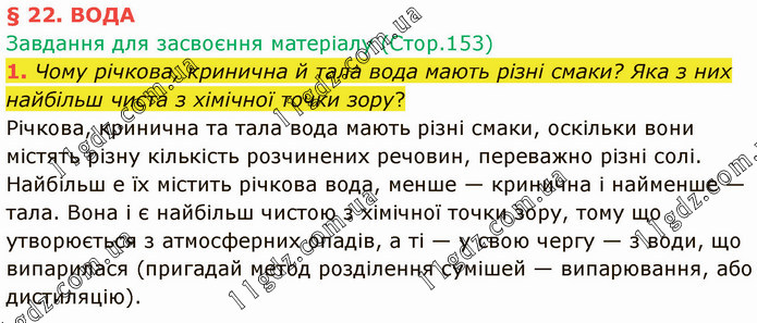 § 22. ВОДА Завдання для засвоєння матеріалу (Стор.153) 1. Чому річкова, кринична й тала вода мають різні смаки? Яка з них найбільш чиста з хімічної точки зору? Річкова, кринична та тала вода мають різні смаки, оскільки вони містять різну кількість розчинених речовин, переважно різні солі. Найбільш е їх містить річкова вода, менше — кринична і найменше — тала. Вона і є найбільш чистою з хімічної точки зору, тому що утворюється з атмосферних опадів, а ті — у свою чергу — з води, що випарилася (пригадай метод розділення сумішей — випарювання, або дистиляцію).