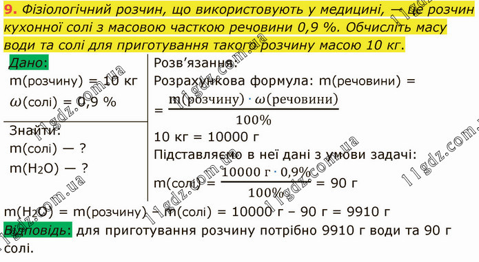 Фізіологічний розчин, що використовують у медицині, — це розчин кухонної солі з масовою часткою речовини 0,9 %. Обчисліть масу води та солі для приготування такого розчину масою 10 кг. Розв’язання: Розрахункова формула: m(речовини) = = (m(розчину) ∙ ω(речовини))/(100%) 10 кг = 10000 г Підставляємо в неї дані з умови задачі: m(солі) = (10000 г ∙ 0,9%)/(100%) = 90 г m(Н2O) = m(розчину) – m(солі) = 10000 г – 90 г = 9910 г Відповідь: для приготування розчину потрібно 9910 г води та 90 г солі.