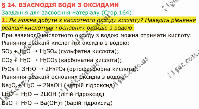 § 24. ВЗАЄМОДІЯ ВОДИ З ОКСИДАМИ Завдання для засвоєння матеріалу (Стор.164) 1. Як можна добути з кислотного оксиду кислоту? Наведіть рівняння реакцій кислотних і основних оксидів з водою. При взаємодії кислотного оксиду з водою можна отримати кислоту. Рівняння реакцій кислотних оксидів з водою: SO3 + Н2O ➝ Н2SО4 (сульфатна кислота); СO2 + Н2O ➝ Н2СO3 (карбонатна кислота); Р2O5 + ЗН2O ➝ 2Н3РO4 (ортофосфорна кислота). Рівняння реакцій основних оксидів з водою Na2O + H2O → 2NaOH (натрій гідроксид) Li2O + H2O → 2LiOH (літій гідроксид) ВаО + Н2О → Ва(ОН)2 (барій гідроксид)