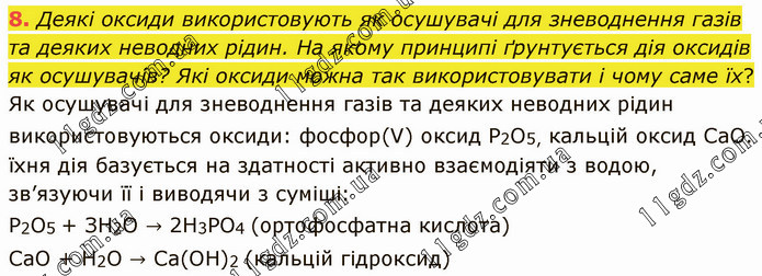Деякі оксиди використовують як осушувачі для зневоднення газів та деяких неводних рідин. На якому принципі ґрунтується дія оксидів як осушувачів? Які оксиди можна так використовувати і чому саме їх? Як осушувачі для зневоднення газів та деяких неводних рідин використовуються оксиди: фосфор(V) оксид Р2O5, кальцій оксид СаО. їхня дія базується на здатності активно взаємодіяти з водою, зв’язуючи її і виводячи з суміші: Р2O5 + ЗН2O → 2Н3РO4 (ортофосфатна кислота) СаО + Н2O → Са(ОН)2 (кальцій гідроксид)
