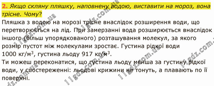 Якщо скляну пляшку, наповнену водою, виставити на мороз, вона трісне. Чому? Пляшка з водою на морозі трісне внаслідок розширення води, що перетворюється на лід. При замерзанні вода розширюється внаслідок іншого (більш упорядкованого) розташування молекул, за якого розмір пустот між молекулами зростає. Густина рідкої води 1000 кг/м3, густина льоду 917 кг/м3. Ти можеш переконатися, що густина льоду менша за густину рідкої води, у спостереженні: льодові крижини не тонуть, а плавають по її поверхні.