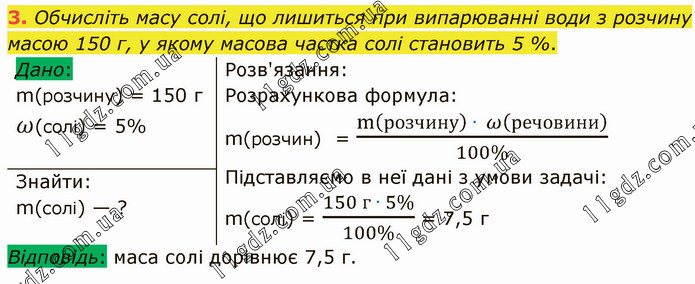 Обчисліть масу солі, що лишиться при випарюванні води з розчину масою 150 г, у якому масова частка солі становить 5 %. Розв'язання: Розрахункова формула: m(розчин) = (m(розчину) ∙ ω(речовини))/(100%) Підставляємо в неї дані з умови задачі: m(солі) = (150 г ∙ 5%)/(100%) = 7,5 г