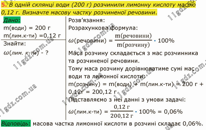 В одній склянці води (200 г) розчинили лимонну кислоту масою 0,12 г. Визначте масову частку розчиненої речовини. Розв’язання: Розрахункова формула: ω(речовини) = m(речовини)/m(розчину) ∙ 100% Маса розчину складається з мас розчинника та розчиненої речовини. Тому маса розчину дорівнюватиме сумі мас води та лимонної кислоти: m(розчину) = m(води) + m(лим.к-ти) = 200 г + 0,12г = 200,12 г Підставляємо з неї данні з умови задачі: ω(лим.к-ти) = (0,12 г)/(200,12 г) ∙ 100% = 0,06%