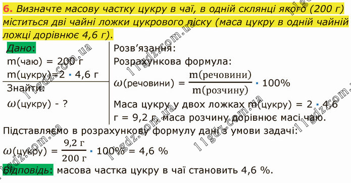 Визначте масову частку цукру в чаї, в одній склянці якого (200 г) міститься дві чайні ложки цукрового піску (маса цукру в одній чайній ложці дорівнює 4,6 г). Розв’язання: Розрахункова формула: ω(речовини) = m(речовини)/m(розчину) ∙ 100% Маса цукру у двох ложках m(цукру) = 2 ∙ 4,6 г = 9,2 г, маса розчину дорівнює масі чаю. Підставляємо в розрахункову формулу дані з умови задачі: ω(цукру) = (9,2 г)/(200 г) ∙ 100% = 4,6 % Відповідь: масова частка цукру в чаї становить 4,6 %.