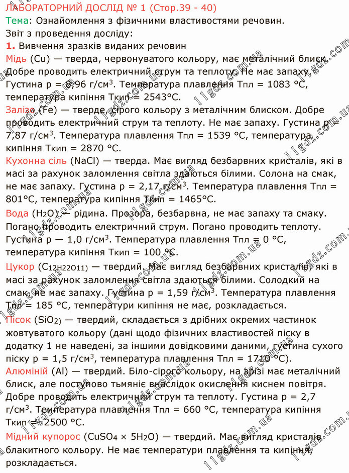 ЛАБОРАТОРНИЙ ДОСЛІД № 1 (Стор.39 - 40) Тема: Ознайомлення з фізичними властивостями речовин. Звіт з проведення досліду: 1. Вивчення зразків виданих речовин Мідь (Сu) — тверда, червонуватого кольору, має металічний блиск. Добре проводить електричний струм та теплоту. Не має запаху. Густина р = 8,96 г/см3. Температура плавлення Тпл = 1083 °С, температура кипіння Ткип = 2543°С. Залізо (Fе) — тверде, сірого кольору з металічним блиском. Добре проводить електричний струм та теплоту. Не має запаху. Густина р = 7,87 г/см3. Температура плавлення Тпл = 1539 °С, температура кипіння Ткип = 2870 °С. Кухонна сіль (NаСl) — тверда. Має вигляд безбарвних кристалів, які в масі за рахунок заломлення світла здаються білими. Солона на смак, не має запаху. Густина р = 2,17 г/см3. Температура плавлення Тпл = 801°С, температура кипіння Ткип = 1465°С. Вода (Н2О) — рідина. Прозора, безбарвна, не має запаху та смаку. Погано проводить електричний струм. Погано проводить теплоту. Густина р — 1,0 г/см3. Температура плавлення Тпл = 0 °С, температура кипіння Ткип = 100 °С. Цукор (С12Н22О11) — твердий. Має вигляд безбарвних кристалів, які в масі за рахунок заломлення світла здаються білими. Солодкий на смак, не має запаху. Густина р = 1,59 г/см3. Температура плавлення Тпл = 185 °С, температури кипіння не має, розкладається. Пісок (SiO2) — твердий, складається з дрібних окремих частинок жовтуватого кольору (дані щодо фізичних властивостей піску в додатку 1 не наведені, за іншими довідковими даними, густина сухого піску р = 1,5 г/см3, температура плавлення Тпл = 1710 °С). Алюміній (Аl) — твердий. Біло-сірого кольору, на зрізі має металічний блиск, але поступово тьмяніє внаслідок окислення киснем повітря. Добре проводить електричний струм та теплоту. Густина р = 2,7 г/см3. Температура плавлення Тпл = 660 °С, температура кипіння Ткип = 2500 °С. Мідний купорос (СuSO4 × 5Н2O) — твердий. Має вигляд кристалів блакитного кольору. Не має температури плавлення та кипіння, розкладається.