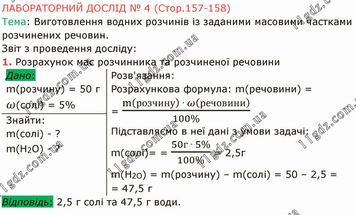 ЛАБОРАТОРНИЙ ДОСЛІД № 4 (Стор.157-158) Тема: Виготовлення водних розчинів із заданими масовими частками розчинених речовин. Звіт з проведення досліду: 1. Розрахунок мас розчинника та розчиненої речовини Розв'язання: Розрахункова формула: m(речовини) = = (m(розчину) ∙ ω(речовини))/(100%) Підставляємо в неї дані з умови задачі: m(солі)= = (50г ∙ 5%)/(100%) = 2,5г m(H2O) = m(розчину) – m(солі) = 50 – 2,5 = = 47,5 г