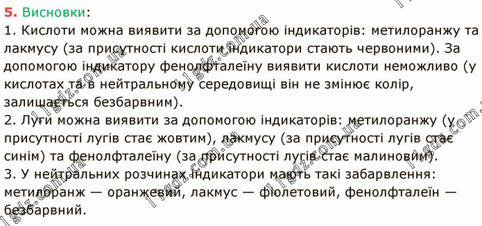 5. Висновки: 1. Кислоти можна виявити за допомогою індикаторів: метилоранжу та лакмусу (за присутності кислоти індикатори стають червоними). За допомогою індикатору фенолфталеїну виявити кислоти неможливо (у кислотах та в нейтральному середовищі він не змінює колір, залишається безбарвним). 2. Луги можна виявити за допомогою індикаторів: метилоранжу (у присутності лугів стає жовтим), лакмусу (за присутності лугів стає синім) та фенолфталеїну (за присутності лугів стає малиновим). 3. У нейтральних розчинах індикатори мають такі забарвлення: метилоранж — оранжевий, лакмус — фіолетовий, фенолфталеїн — безбарвний.