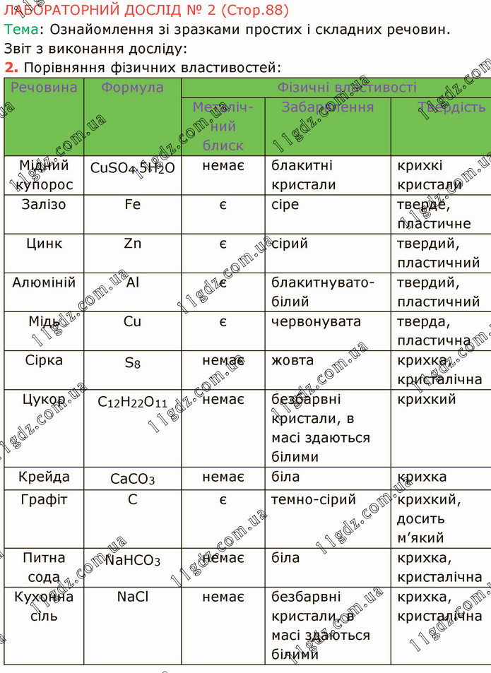 ЛАБОРАТОРНИЙ ДОСЛІД № 2 (Стор.88) Тема: Ознайомлення зі зразками простих і складних речовин. Звіт з виконання досліду: 2. Порівняння фізичних властивостей: