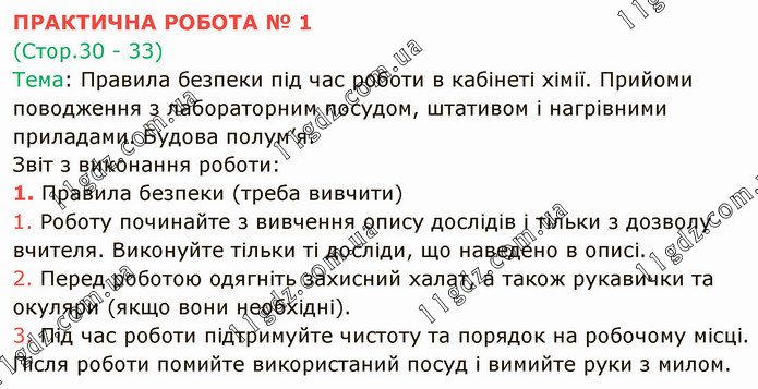 ПРАКТИЧНА РОБОТА № 1 (Стор.30 - 33) Тема: Правила безпеки під час роботи в кабінеті хімії. Прийоми поводження з лабораторним посудом, штативом і нагрівними приладами. Будова полум’я. Звіт з виконання роботи: 1. Правила безпеки (треба вивчити) 1. Роботу починайте з вивчення опису дослідів і тільки з дозволу вчителя. Виконуйте тільки ті досліди, що наведено в описі. 2. Перед роботою одягніть захисний халат, а також рукавички та окуляри (якщо вони необхідні). 3. Під час роботи підтримуйте чистоту та порядок на робочому місці. Після роботи помийте використаний посуд і вимийте руки з милом.