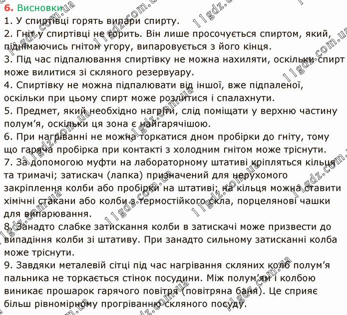 6. Висновки 1. У спиртівці горять випари спирту. 2. Гніт у спиртівці не горить. Він лише просочується спиртом, який, піднімаючись гнітом угору, випаровується з його кінця. 3. Під час підпалювання спиртівку не можна нахиляти, оскільки спирт може вилитися зі скляного резервуару. 4. Спиртівку не можна підпалювати від іншої, вже підпаленої, оскільки при цьому спирт може розлитися і спалахнути. 5. Предмет, який необхідно нагріти, слід поміщати у верхню частину полум’я, оскільки ця зона є найгарячішою. 6. При нагріванні не можна торкатися дном пробірки до гніту, тому що гаряча пробірка при контакті з холодним гнітом може тріснути. 7. За допомогою муфти на лабораторному штативі кріпляться кільця та тримачі; затискач (лапка) призначений для нерухомого закріплення колби або пробірки на штативі; на кільця можна ставити хімічні стакани або колби з термостійкого скла, порцелянові чашки для випарювання. 8. Занадто слабке затискання колби в затискачі може призвести до випадіння колби зі штативу. При занадто сильному затисканні колба може тріснути. 9. Завдяки металевій сітці під час нагрівання скляних колб полум’я пальника не торкається стінок посудини. Між полум’ям і колбою виникає прошарок гарячого повітря (повітряна баня). Це сприяє більш рівномірному прогріванню скляного посуду.