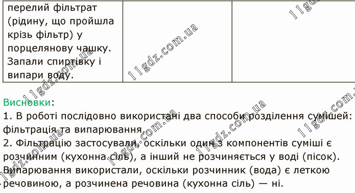 Висновки: 1. В роботі послідовно використані два способи розділення сумішей: фільтрація та випарювання. 2. Фільтрацію застосували, оскільки один з компонентів суміші є розчинним (кухонна сіль), а інший не розчиняється у воді (пісок). Випарювання використали, оскільки розчинник (вода) є леткою речовиною, а розчинена речовина (кухонна сіль) — ні.