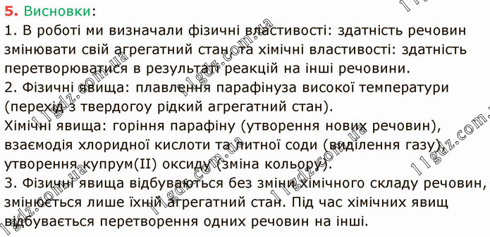 5. Висновки: 1. В роботі ми визначали фізичні властивості: здатність речовин змінювати свій агрегатний стан, та хімічні властивості: здатність перетворюватися в результаті реакцій на інші речовини. 2. Фізичні явища: плавлення парафінуза високої температури (перехід з твердогоу рідкий агрегатний стан). Хімічні явища: горіння парафіну (утворення нових речовин), взаємодія хлоридної кислоти та питної соди (виділення газу), утворення купрум(ІІ) оксиду (зміна кольору). 3. Фізичні явища відбуваються без зміни хімічного складу речовин, змінюється лише їхній агрегатний стан. Під час хімічних явищ відбувається перетворення одних речовин на інші.