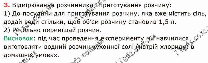 3. Відмірювання розчинника і приготування розчину: 1) До посудини для приготування розчину, яка вже містить сіль, додай води стільки, щоб об’єм розчину становив 1,5 л. 2) Ретельно перемішай розчин. Висновок: під час проведення експерименту ми навчилися виготовляти водний розчин кухонної солі (натрій хлориду) в домашніх умовах.
