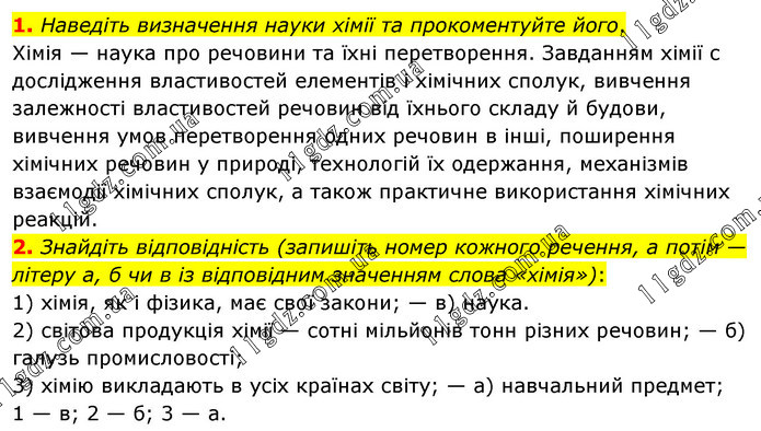 Наведіть визначення науки хімії та прокоментуйте його. Хімія — наука про речовини та їхні перетворення. Завданням хімії с дослідження властивостей елементів і хімічних сполук, вивчення залежності властивостей речовин від їхнього складу й будови, вивчення умов перетворення одних речовин в інші, поширення хімічних речовин у природі, технологій їх одержання, механізмів взаємодії хімічних сполук, а також практичне використання хімічних реакцій. 2. Знайдіть відповідність (запишіть номер кожного речення, а потім — літеру а, б чи в із відповідним значенням слова «хімія»): 1) хімія, як і фізика, має свої закони; — в) наука. 2) світова продукція хімії — сотні мільйонів тонн різних речовин; — б) галузь промисловості; 3) хімію викладають в усіх країнах світу; — а) навчальний предмет; 1 — в; 2 — б; 3 — а.